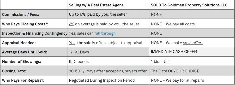So when you add up the time you could save by working with Goldman Property Holdings, the no-hassle experience, and the money you’ll save on commissions, fees, and holding costs while you wait to sell the traditional route… for many area homeowners selling to a professional house buyer is the best viable option.